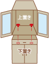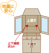 〔1〕背の高い家具は、上下連結金具がついているものが多いので、必ず上下連結金具を付けてください。上下連結をしませんと、揺れの反動により、上置きが数メートルも飛ぶことがあります。上下連結のない場合は、市販の金具を裏から家具にもみつけるなどして止めてください。また、開いた扉の重みにより上置きが前に倒れることもあります。扉の開き防止に耐震ラッチも有効です。 |