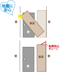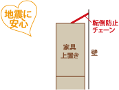 〔2〕家具の上部を、転倒防止チェーンで建物と固定しましょう。箱物の上部を固定することで、箱物の下部を滑らすことができ、地震の揺力を低減させます。(転倒防止につながります。)