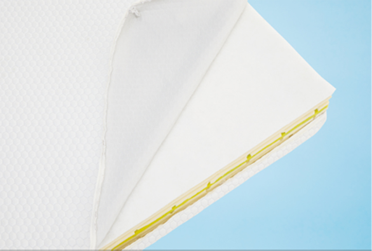 『モールドHEXA(ヘキサ)』のフィット感に加え、強靭かつ弾性回復力の強い『ファイバークッション』、マットレス内部の通気性を高める『高通気フォーム』を組み合わせた5層構造からモフモはつくられています。
