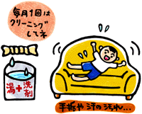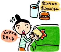 手垢や汗による汚れ 肘や座の前部などの手垢や汗による汚れは、布地を特に劣化させやすく、破れの原因になりやすいので常にお手入れをしてください。中性洗剤を温湯(40℃位)で薄め、布に浸し、固く絞って毛方向、または後ろから前、上から下の方向にふいてください。数回繰り返し、その後きれいな温湯でふいてください。 |