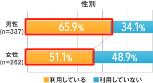 デスクの利用状況は、約60%が「利用している」と回答。性別で見ると、デスクを利用しているのは男性が65.9%、女性は51.1%。男性の方が割合は多いが、女性も半数以上がデスクを利用している。