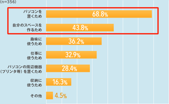 「パソコンを置くため」が68.8%となり、デスクを利用する1番の目的に挙げられている。2番目は「自分のスペースを作るため」が43.8%。趣味や仕事のような「作業」のためだけでなく、家の中で「自分の場所」を作ろうとする気持ちがうかがえる。