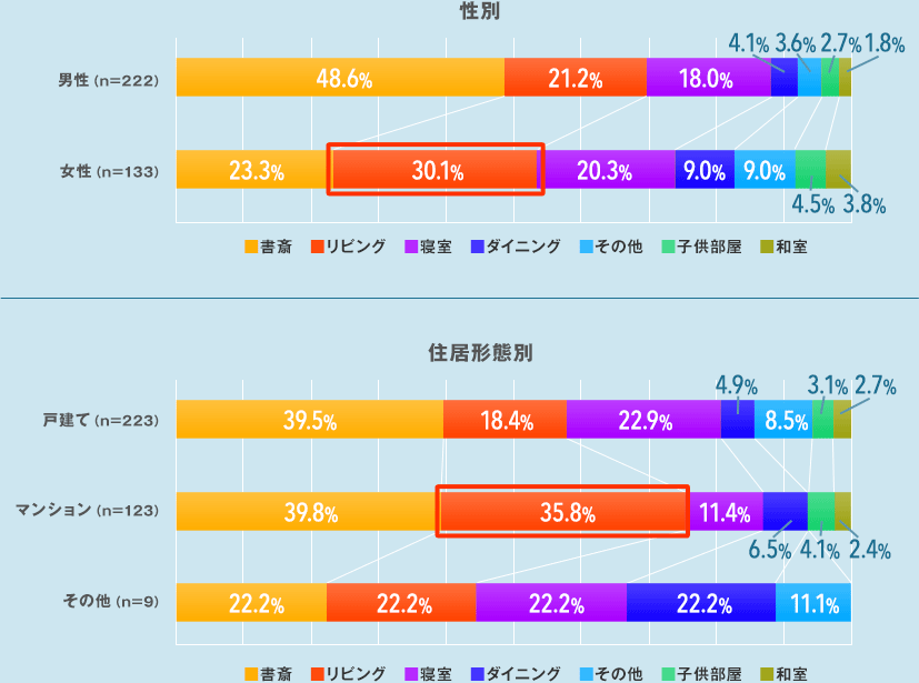 女性は書斎よりもリビングにデスクを置く人が多くなっている。また、住居形態別では、書斎にデスクを置いているのは戸建て・マンションともに約40%とほぼ同じ割合だが、リビングに置いている割合がマンションのほうが2倍ほど多い。マンションでは部屋数やスペースの都合で、リビングへの設置を選択していると考えられる。