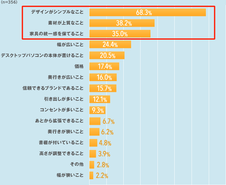 回答数も多く、デスクへの関心の強さが伺えます。是非、デスク選びのご参考にしてください。
