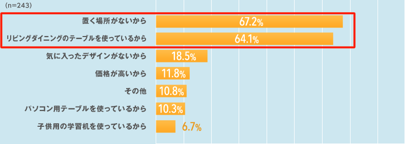 男女とも80%はデスクの必要性を感じている。デスクを持っていない理由は大きく2つに分かれ、「置く場所がないから」(67.2%)、「リビングダイニングのテーブルを使っているから」(64.1%)となった。他の理由と比べて、これら2つが群を抜いて高い。