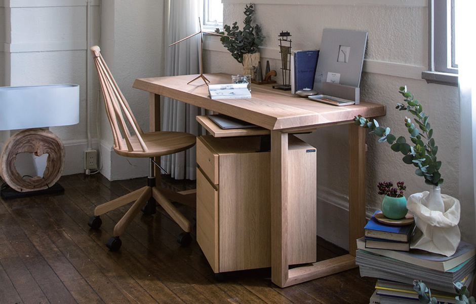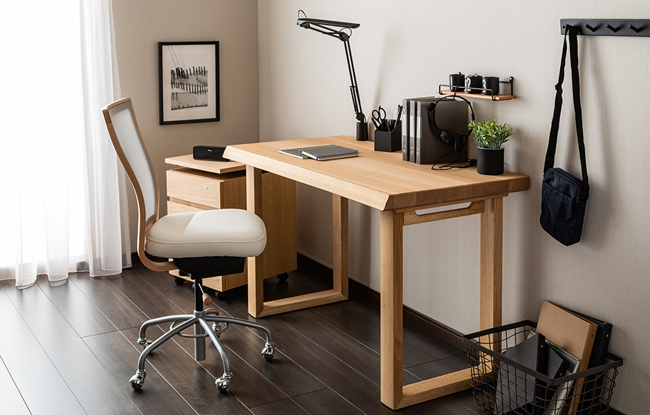 木の表面をそのまま活かしたような、ナチュラルな風合いの一枚板風天板。中学・高校生のこだわりデスクとしてもおすすめです。