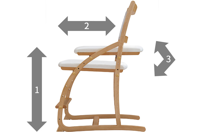 シート1パーツを動かすだけで、①シートの高さ ②シート奥行きの変化 ③シート角度の変化 の3つが連動して調節できます。