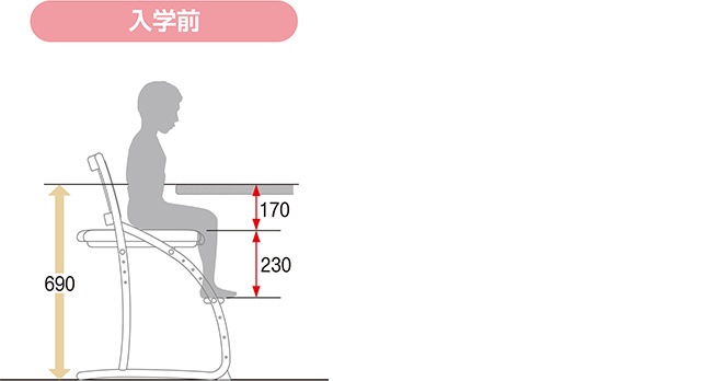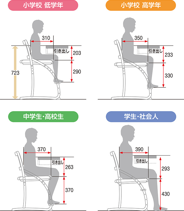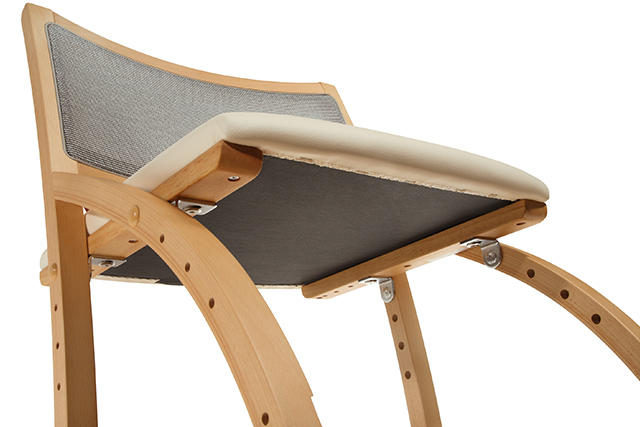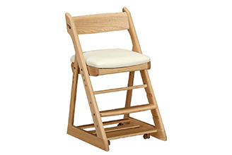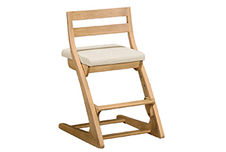 4歳児ごろからダイニングでのコミュニケーションチェアとして、就学後にはデスクチェアとして。より良い学習姿勢がとれる少し前垂れの座面角度から、パソコン操作なども快適な座面角度まで、座面の高さに応じた角度で設計されています。