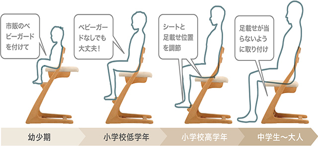 シート・足置きともに高さは4段階で調節可能。シート奥行は80mmの調節が可能で、幼児期から大人になるまで使えます。