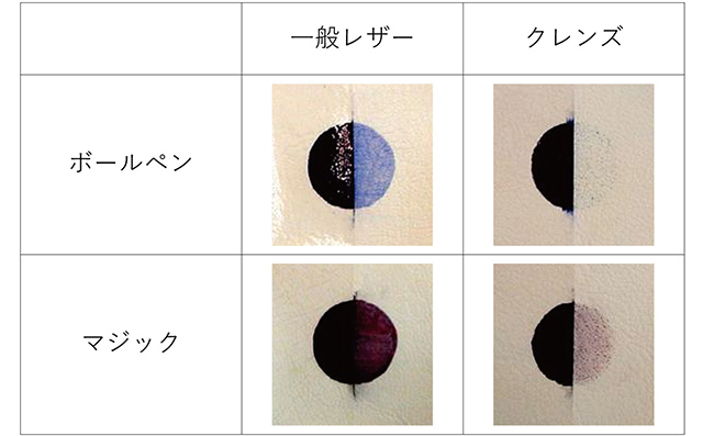 ボールペン及びマジックをレザーに付着させ24時間放置後、エタノールを浸した布にて拭き取り残留状態を確認しました。