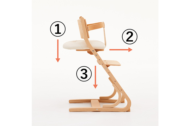 ①シートの高さを5段階調節できます。(57.5~43.1cm)