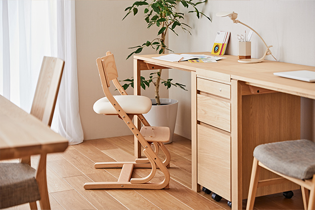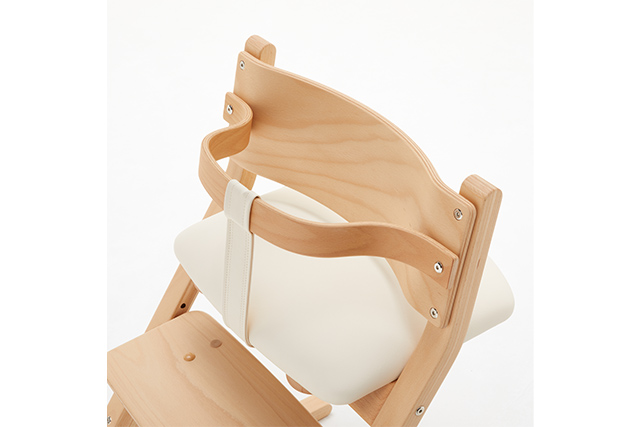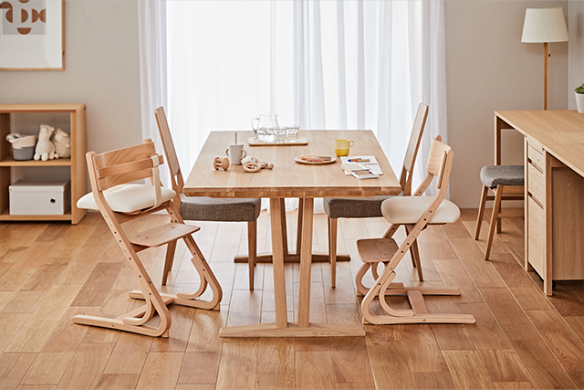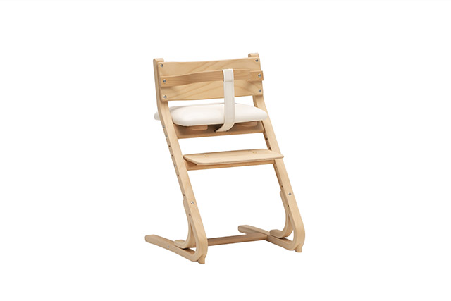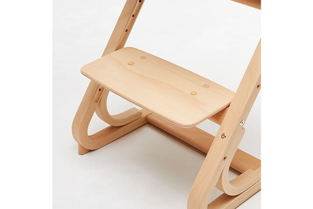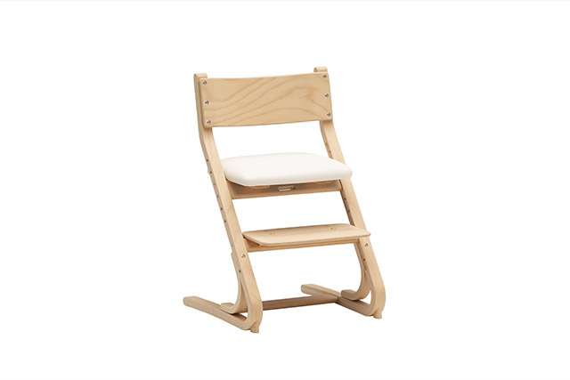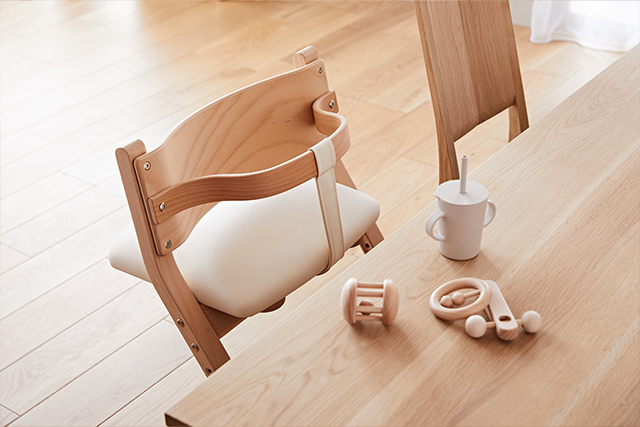 「F step chair エフステップチェア」は、ダイニングでのお食事や子供部屋での勉強など使う場所を選ばず、シートや足載せステップを5段階調節できるので、一人座りを始める幼児期から、入学後も成長に合わせて永くお使いいただけます。