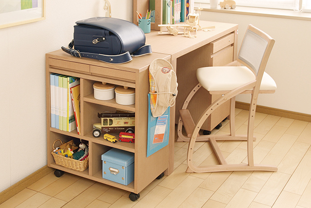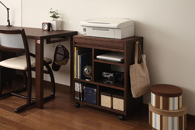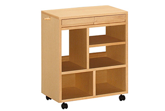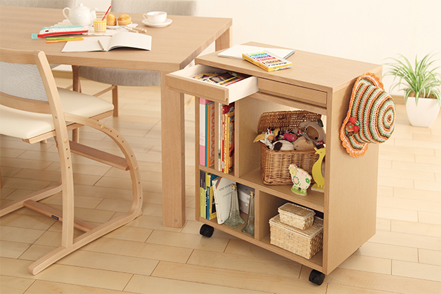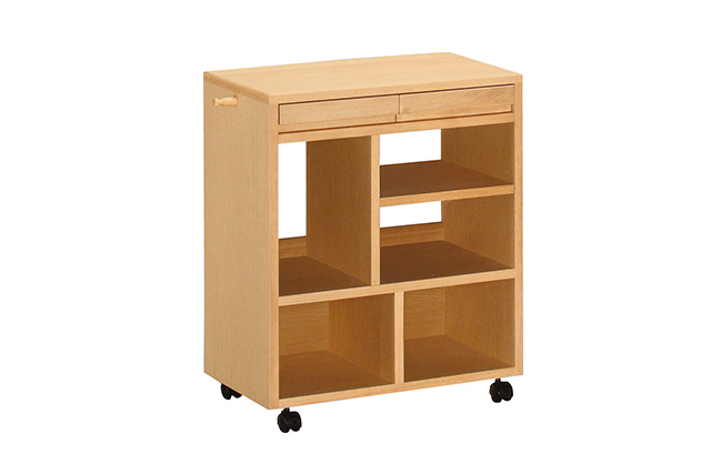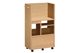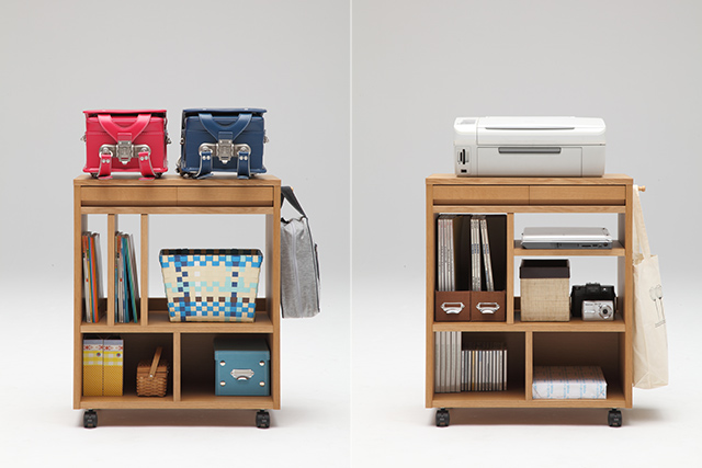 シンプルなデザインのマルチワゴン。ランドセル置きにも、プリンター置きにもなり、リビングダイニングや子供部屋で活躍します。キャスター付きで移動もラクラクです。