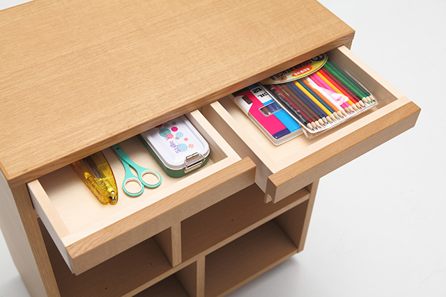 上部には引き出し2杯付き。お絵かきセットや文具などの収納に最適です。 ※引出内寸:幅235 奥行272 深さ48=2杯