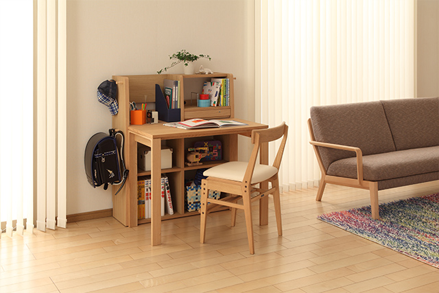学用品のラックとして活躍するマルチシェルフ。2枚の棚板と引き出しを付け替えることができ、成長に伴い変化する収納物に対応。スマート&スリムなデザインでリビングにもマッチします。