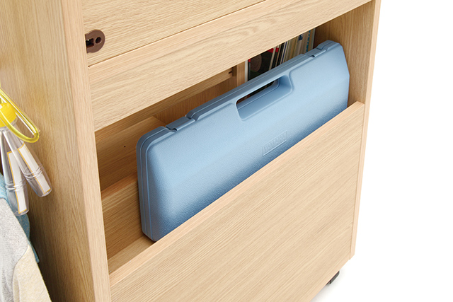 裏側には、収納に困るピアニカの置き場所を設けました。コンセントタップの収納にも便利です。