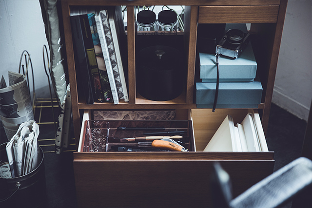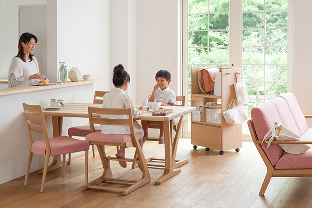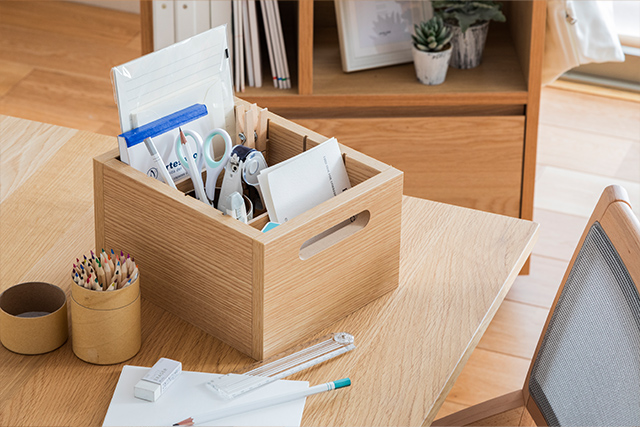 仕切り板付きの小物収納は文房具の持ち運べるからダイニングでの勉強に便利です。