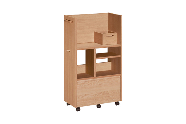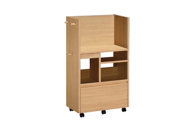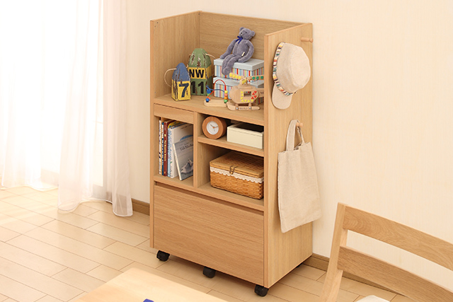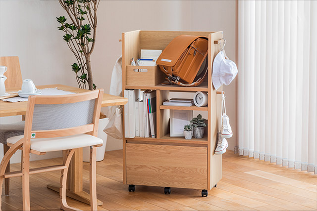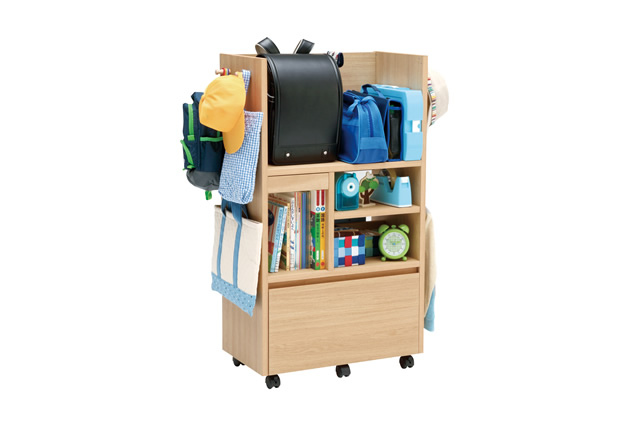 学用品をすっきり収納できるマルチラック。キャスター付きで移動もラクラク、ランドセルを隠して収納もできるのでリビングルームに最適です。