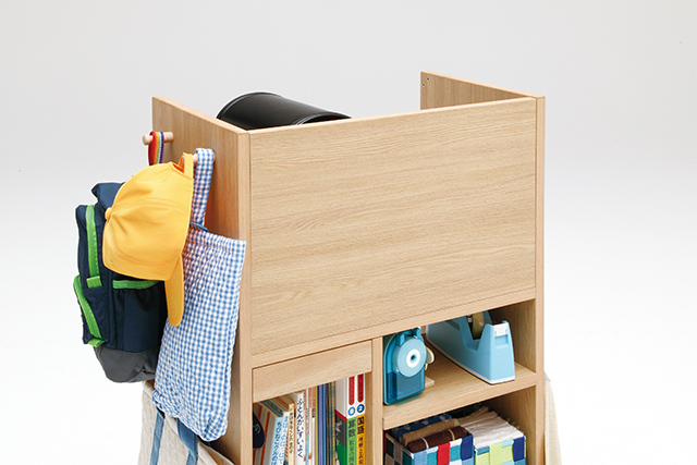 囲いがあるため、置きやすく使いやすいランドセル収納スペース。“来客時にランドセルを隠したい”という声を元に、背板を付け替えできる設計にしました。