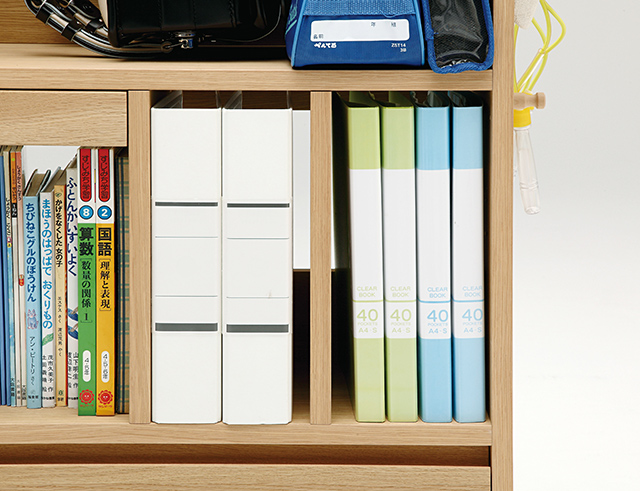 中段スペースの棚板は可動式。置き場所に困るセロハンテープや文具類を置く場合は横位置に。本やファイルを中心に置く場合は縦にして使用します。