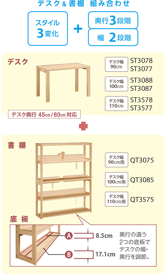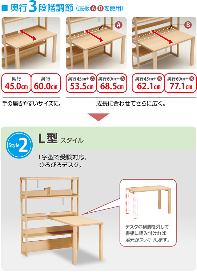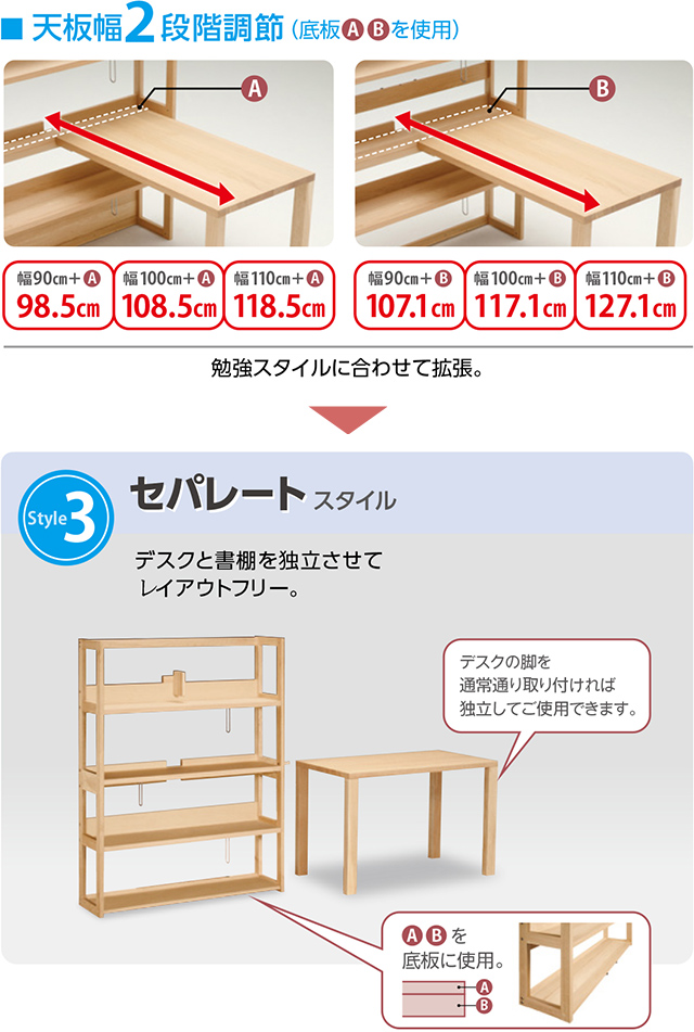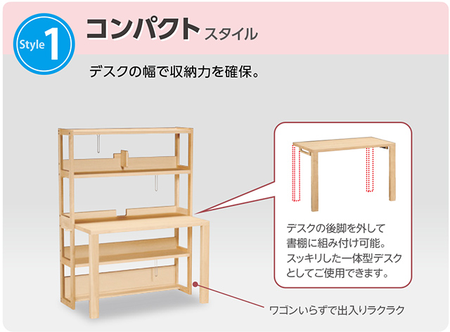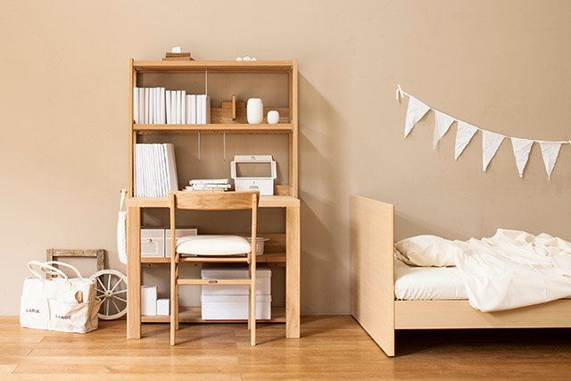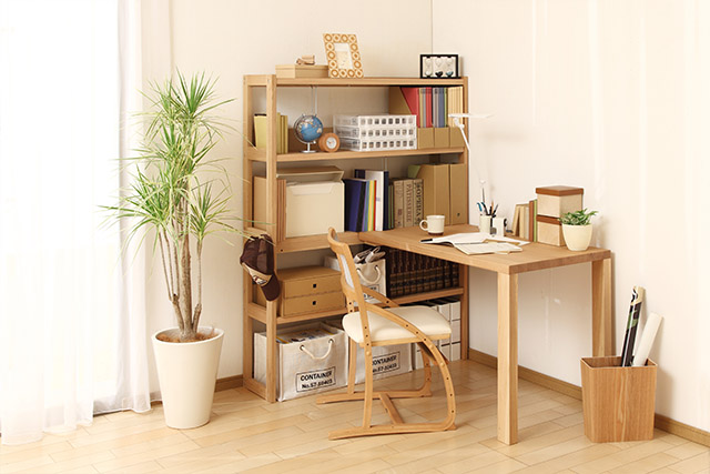 ボナシェルタデスクと組み合わせでは、使い方の変化に合わせて、部屋のレイアウトに合わせて組み替えできます。