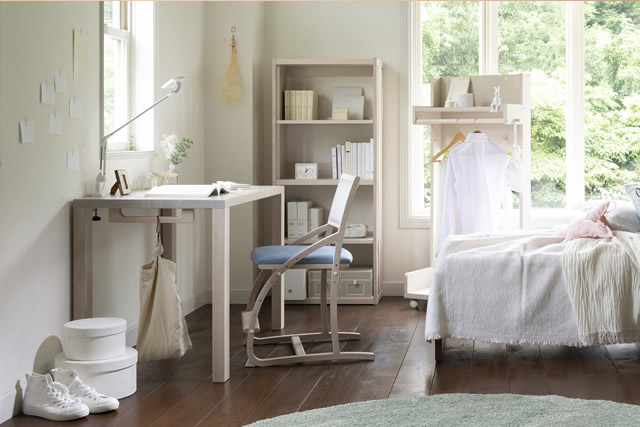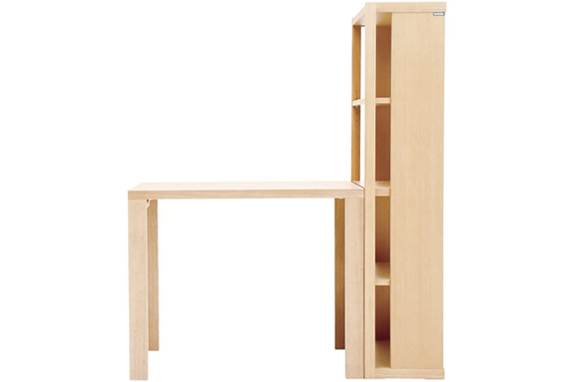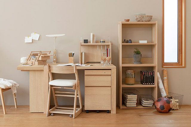 奥行60cmのデスクと横置きのセッティングをすることで、増える教材などをおさめる収納力と出し入れのしやすさを確保しながら、デスク天板も広く使うことができます。正面に圧迫感がないのも、落ち着いた学習環境に貢献します。