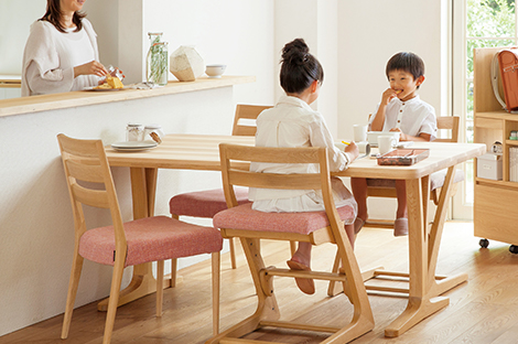 子どもの学習環境としてコミュニケーションに着目したリビング学習。コミュニケーションが小さな時期のお子さまをあたたかく育みます。学用品の収納、学習にも食事にも適したチェアを準備して、より居心地のよい環境をつくりましょう。