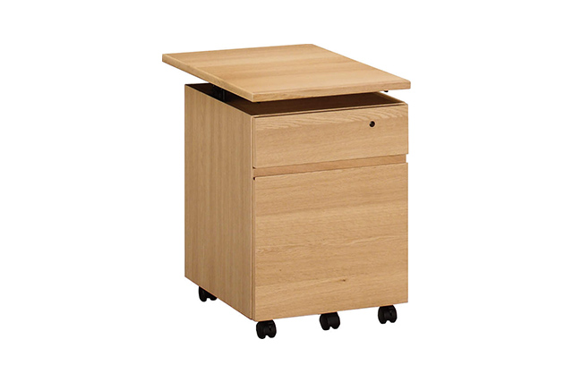 天板を最大まで上げた状態では、ユーティリティプラスのデスクと同じ高さ(723mm)に、下げればデスクの下に収まります。