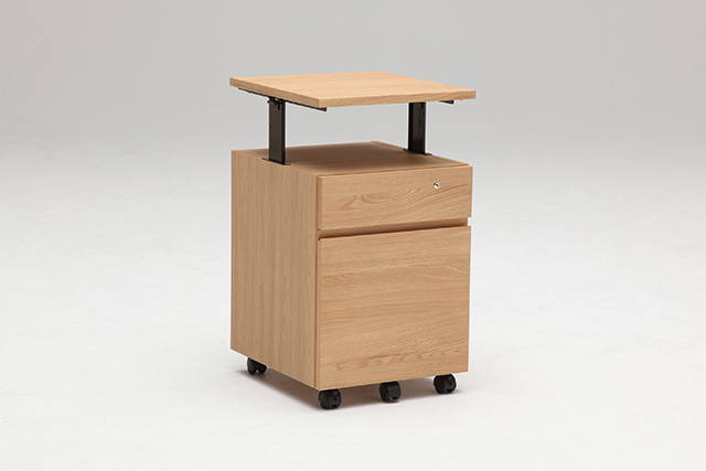 天板は昇降式で、最大まで上げた状態ではユーティリティプラスのデスクと同じ高さに、下げればデスクの下に収まるサイズ設計です。