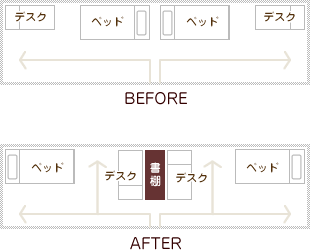 例えば、右図のように両面書棚で、増える収納量をカバーしつつ、お部屋を簡易的に間仕切るのはいかがでしょうか?