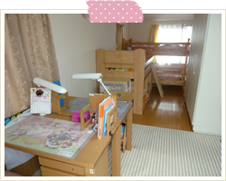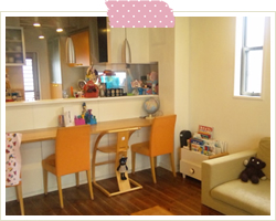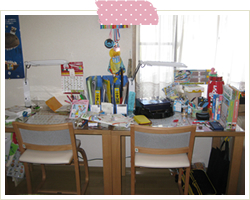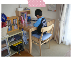 うちの息子は小学生一年生で、デスクをリビングに置きたかったのですがスペースの関係で2階の子供部屋に置いています。教科書などの学校のモノは、すべてそのデスク周りに収納させ、学校の準備はデスクでやり、勉強はリビングでやっています。