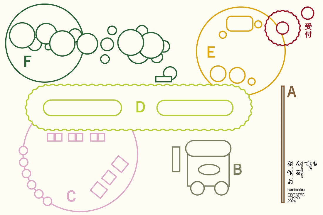 大小の円が連なるような展示レイアウトは、様々な樹木が生息する森をイメージし構成されます。それぞれテーマに合わせて7つのゾーンに分けられ、各ゾーンは森の春夏秋冬を表現したカラーパレットを元にカーテンやカーペットのカラーリングによって区切られます。会場を回遊することで、多様な生態系が育まれている日本の森林を想起させると共に、異なるテーマを掲げる各ゾーンが有機的に繋がっていることが体感できます。
