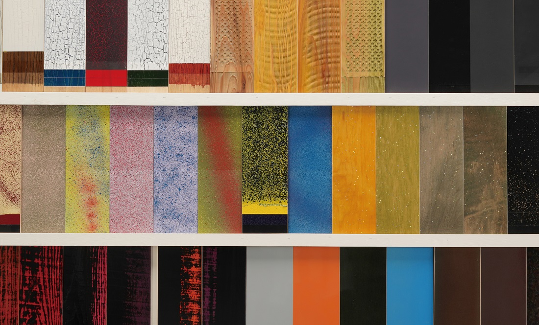 当社がこれまで製作してきた家具のアーカイブや、木工、塗装、多種多様な木材などのサンプルを展示する2Fでは、当社の知見を図書館のように閲覧することができます。広く公開されていない工場の雰囲気を体感してもらえる様に、内装のデザインは、工場で実際に使用されている什器を参考にしています。作業テーブルや、ワゴン、塗装場のポールラックなどをオマージュした展示用の棚など、長年のものづくりの中で研鑽されてきた当社独自の意匠が活用されています。展示品は定期的に更新され、当社の最新の技術研究や、日本各地の素材をいち早く観覧できます。