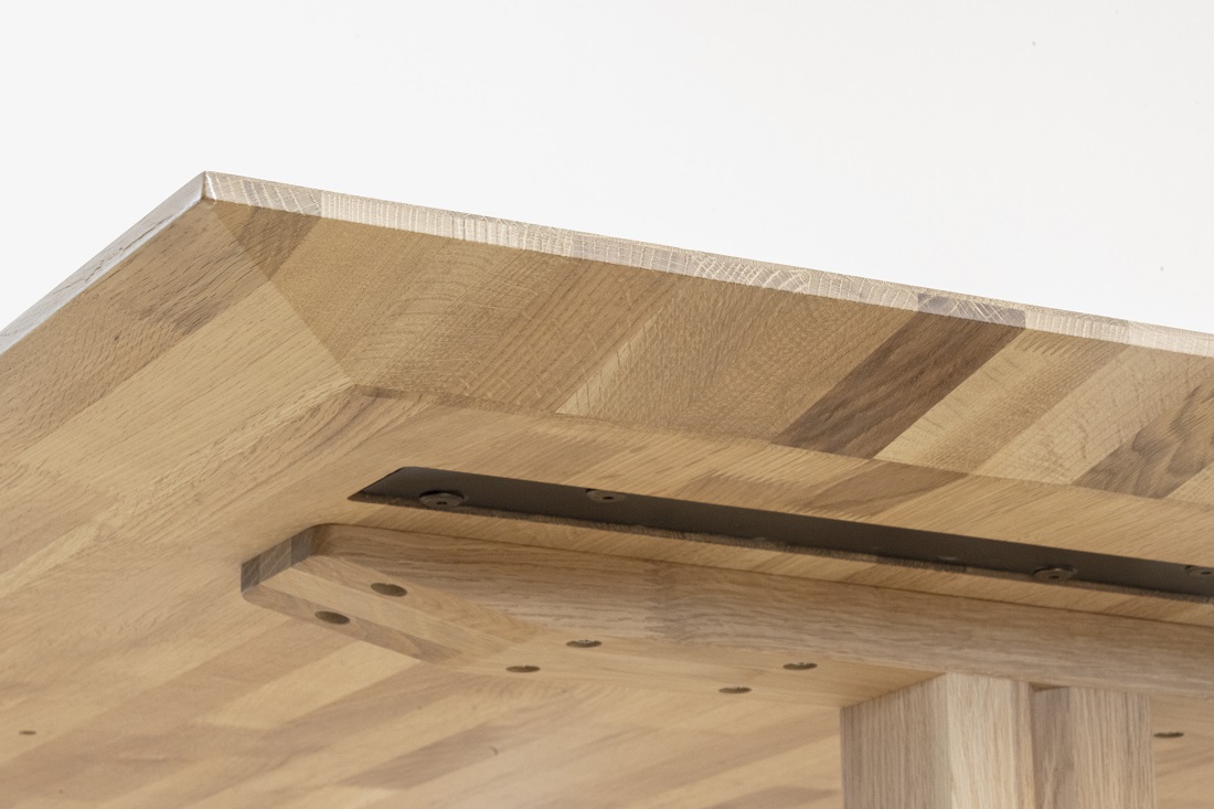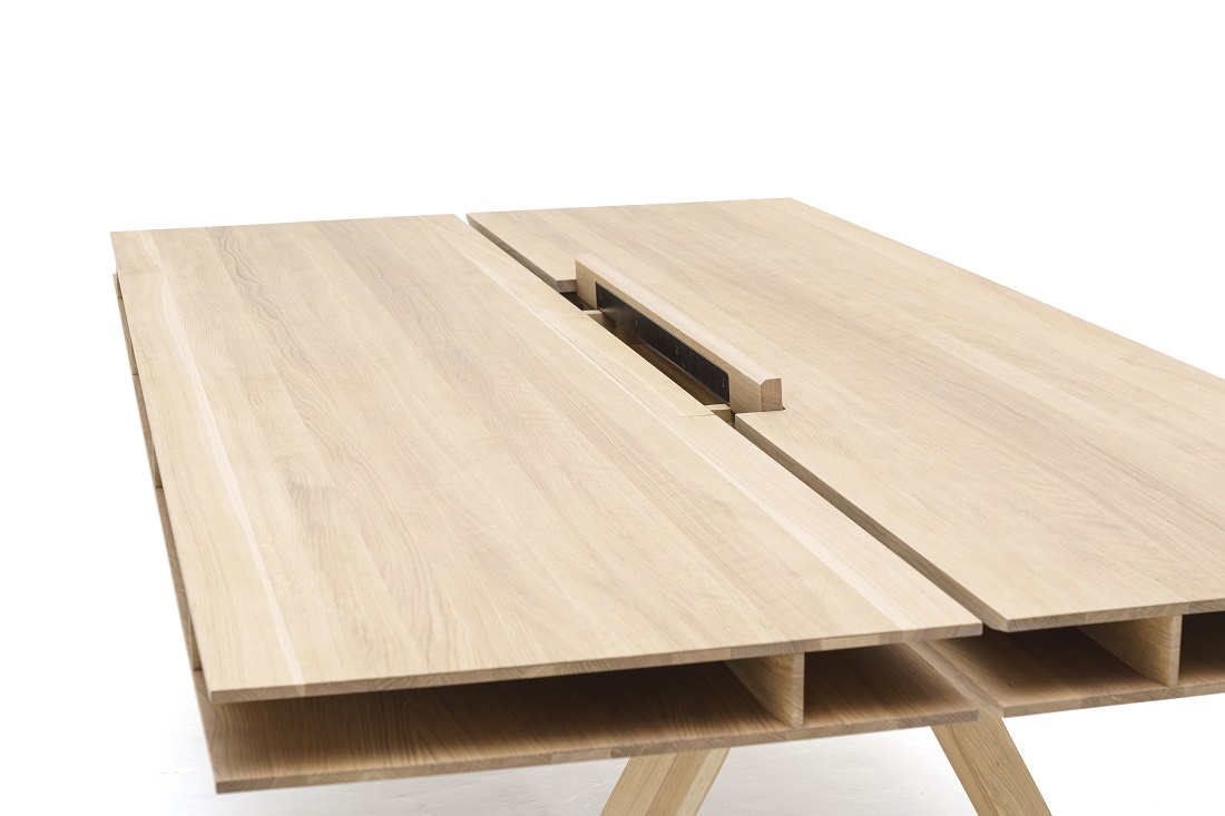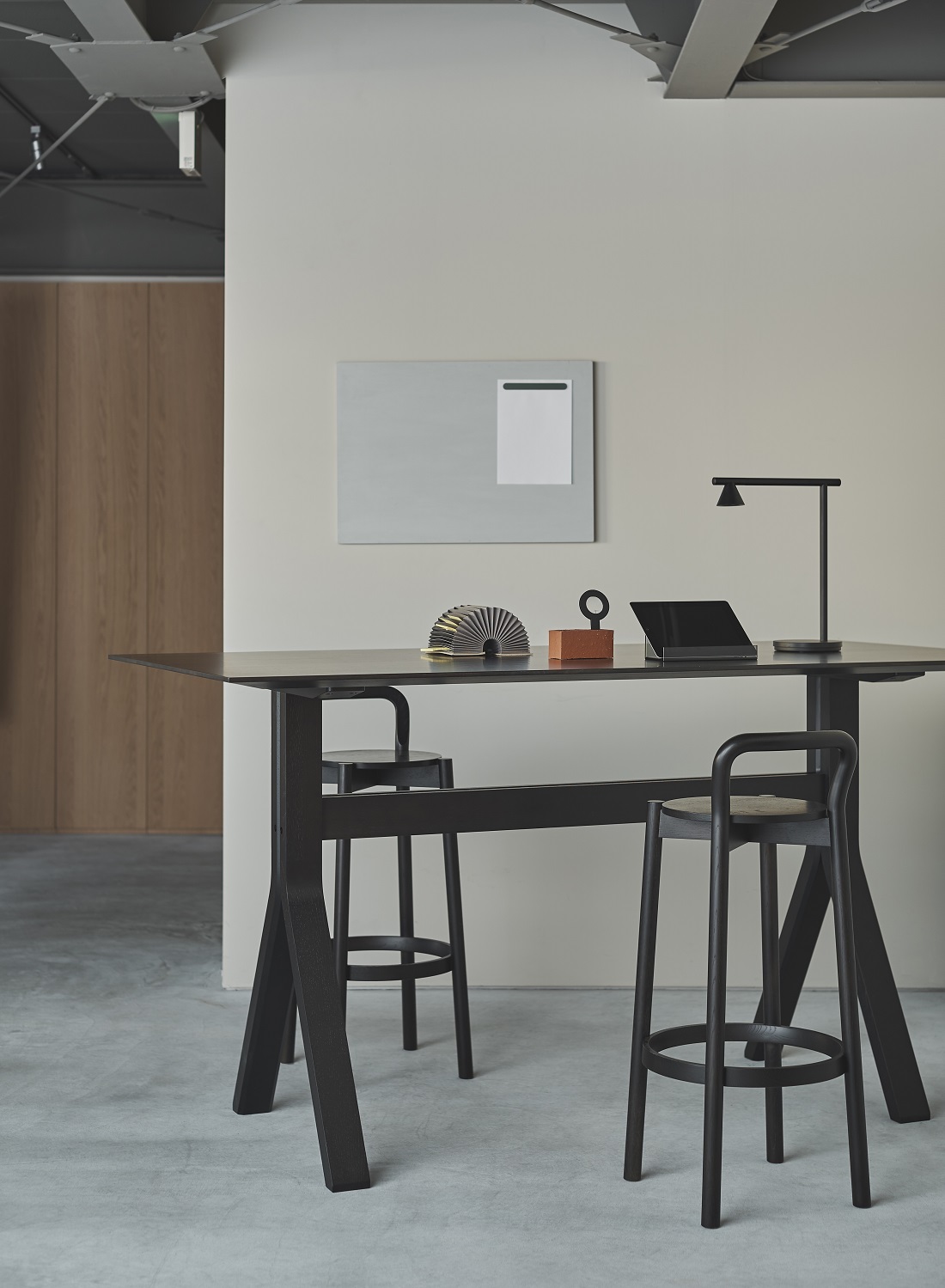 Spectrumシリーズは、ミーティングや食事、作業など多用途対応のテーブルとベンチのシリーズです。ケーブルマネジメント付き、ラウンドやハイテーブル等のバリエーションがあり、日本建築のミニマリズムを取り入れたデザインで美しさと効率性を兼ね備えています。天板は、厚み約3mmの挽板と中芯材を組み合わせた3層構造となっており、節が多い材やシミの多い材などの個性的な木材を中芯材に、表面に仕上げ材として挽板を張り込むことで、木材を有効活用しつつ、すっきりとした美しい仕上がりを実現しています。