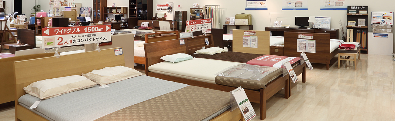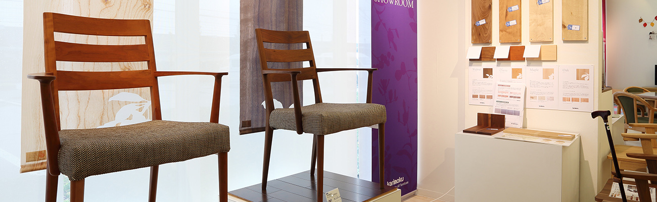 広いフロアに様々なイメージ・アイテムの家具を展示する、木製家具メーカーショールームです。一つひとつ体感しながら、じっくりと家具選びがお楽しみいただけます。どなたでも自由にご覧いただけます。