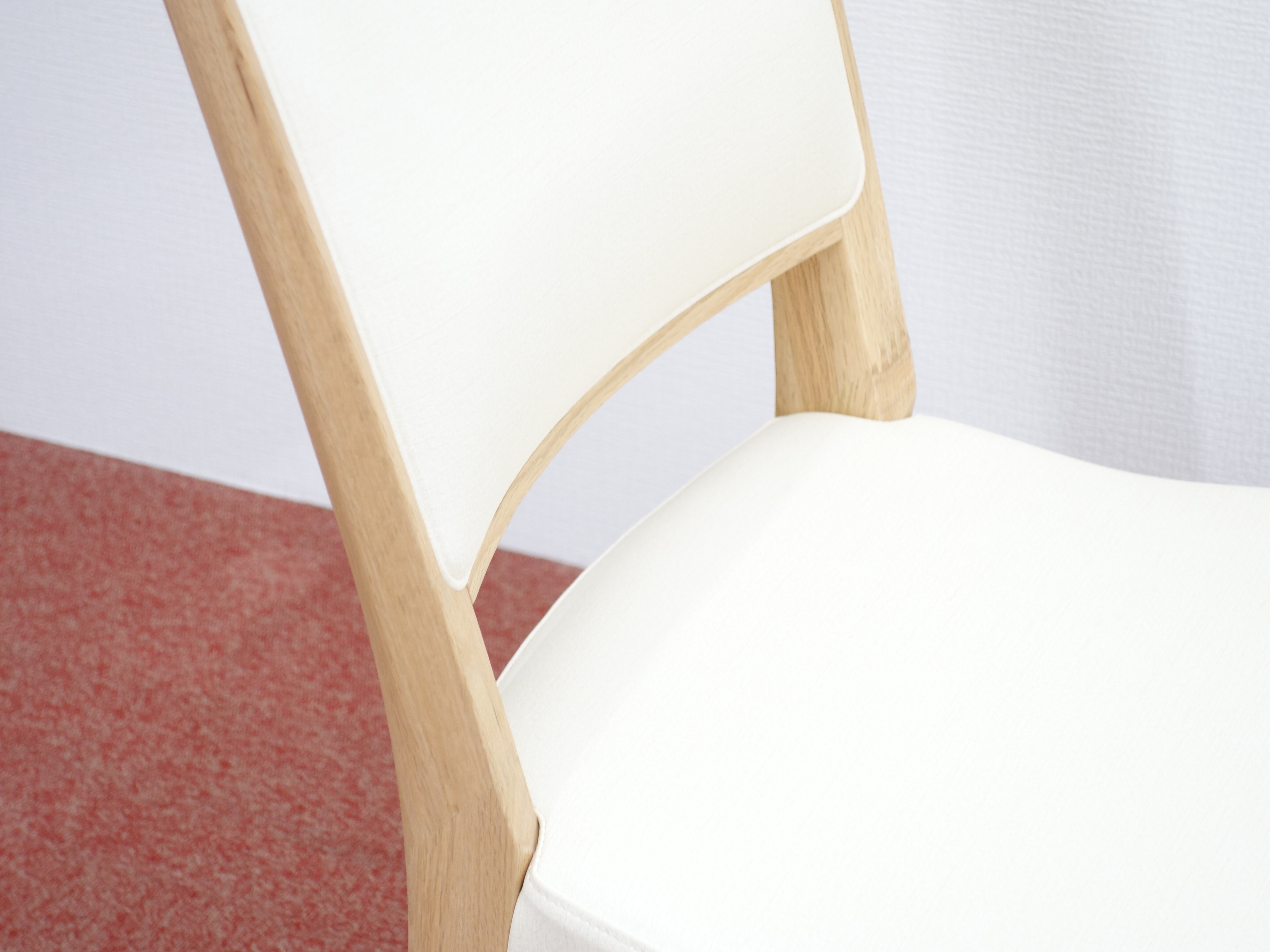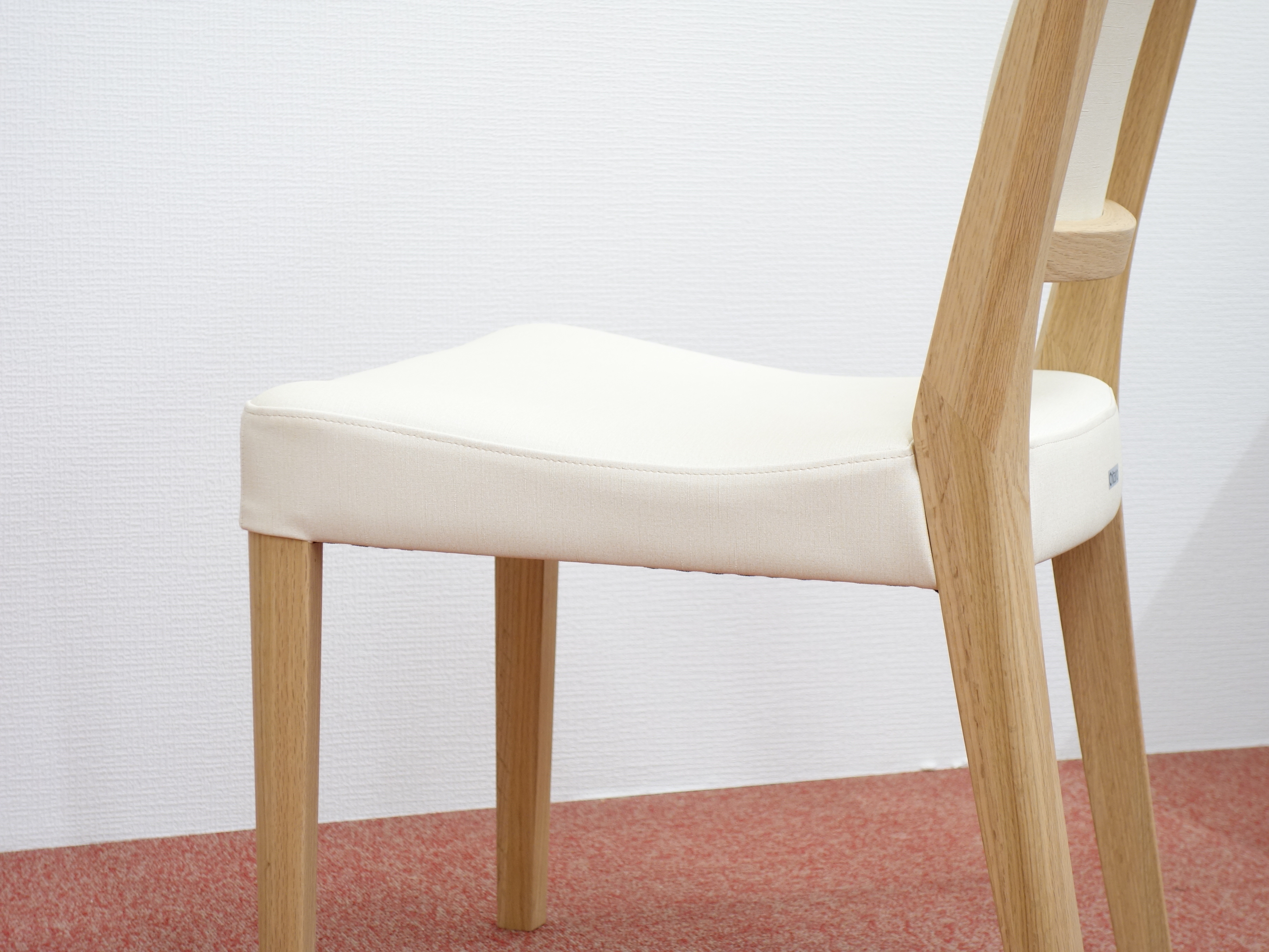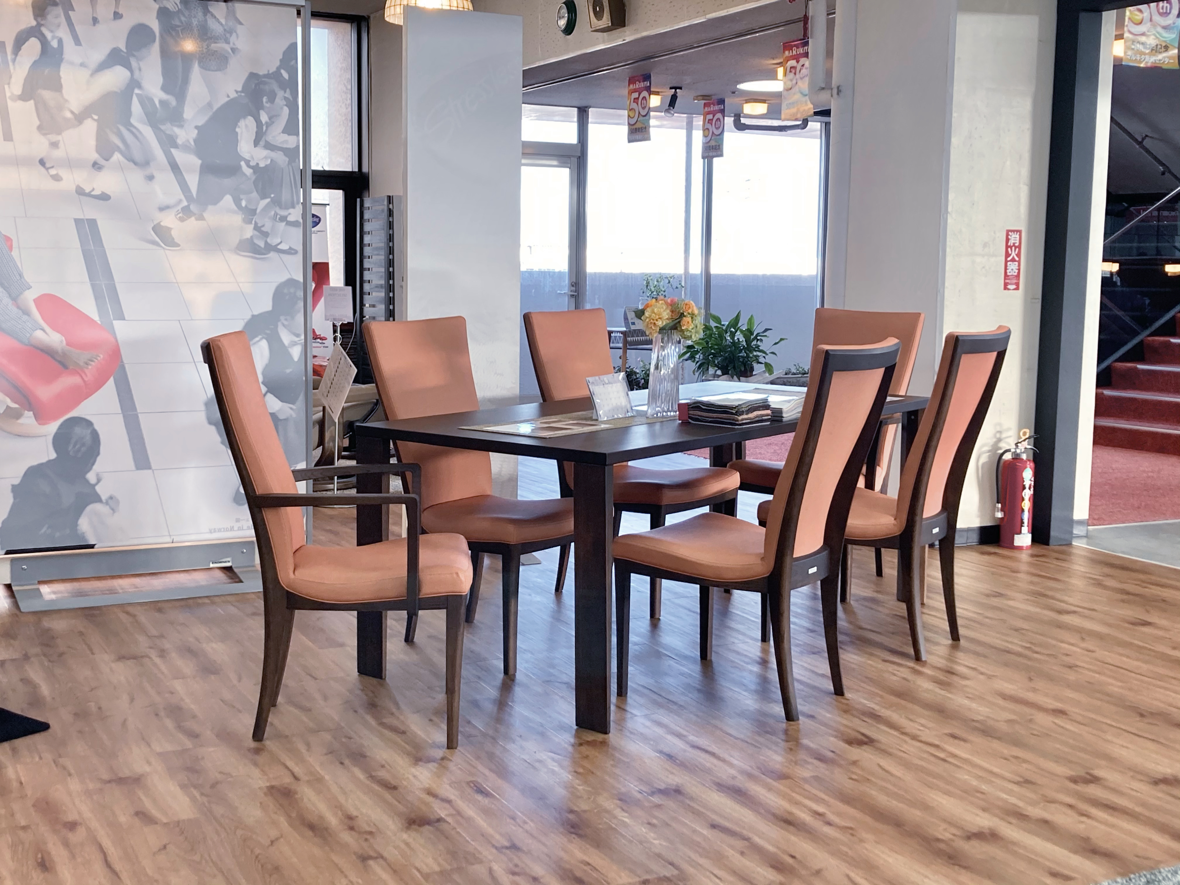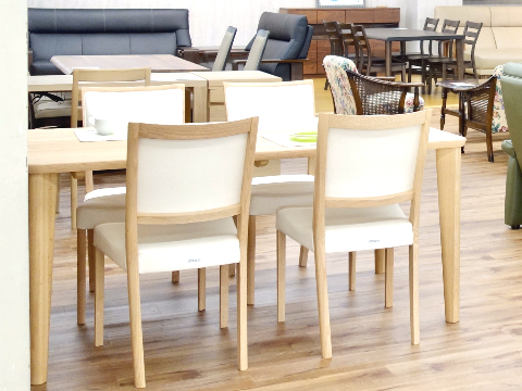 木の素材感がしっかりした無垢板のテーブルは角は丸く、足元がすっきりして、柔らかい印象でも上質感のある人気No.1モデルです。椅子は細くても丈夫なこだわりの設計。日本人にフィットした疲れにくさと軽さをぜひ感じてみて下さい!