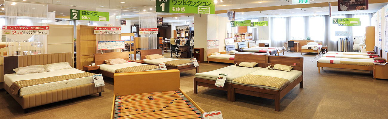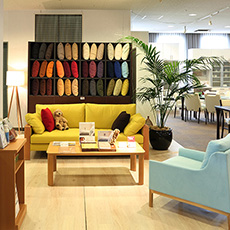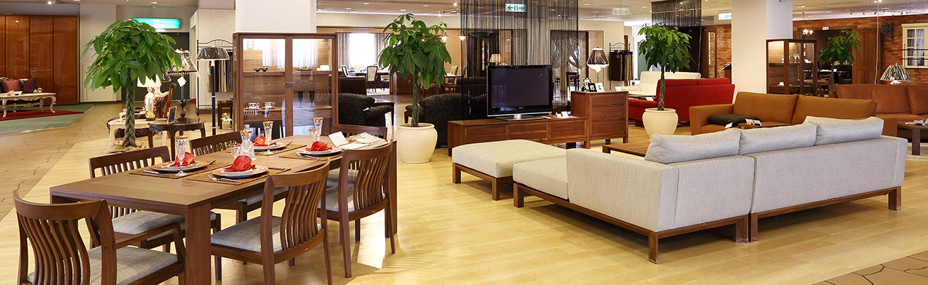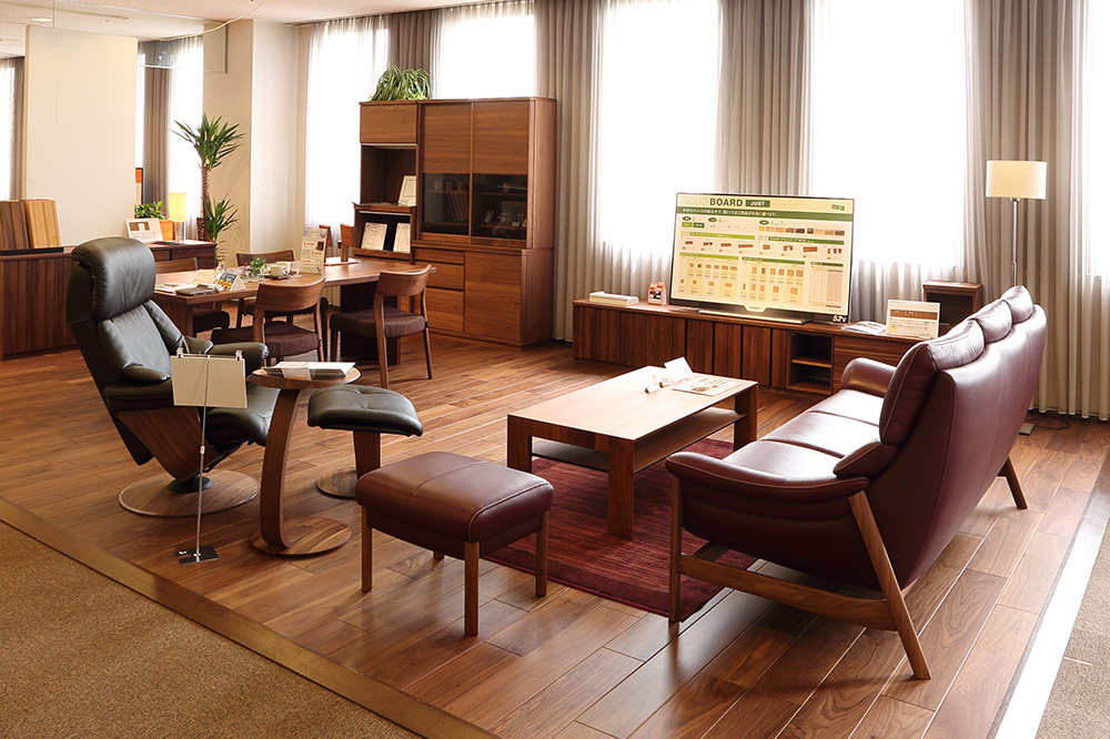 近畿地方最大級の木製家具ショールームです。5階のフロアに様々なイメージの家具を展示。一つひとつ体感しながら、じっくりと家具選びがお楽しみいただけます。どなたでも自由にご覧いただけます。