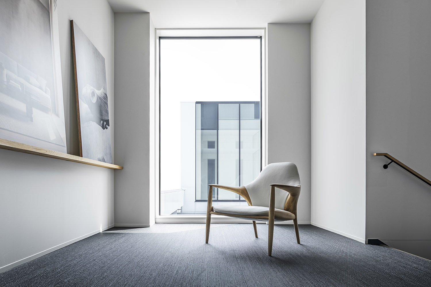 「クンスト ソファーは、カリモクの持つ高度な切削技術と職人の手業が存分に活かされた椅子である。背中とアームと後脚を繋ぐラインが非常に印象的で、木部と張り地の切り返し部分がその美しいラインを殺さず、一体感を生み出している。