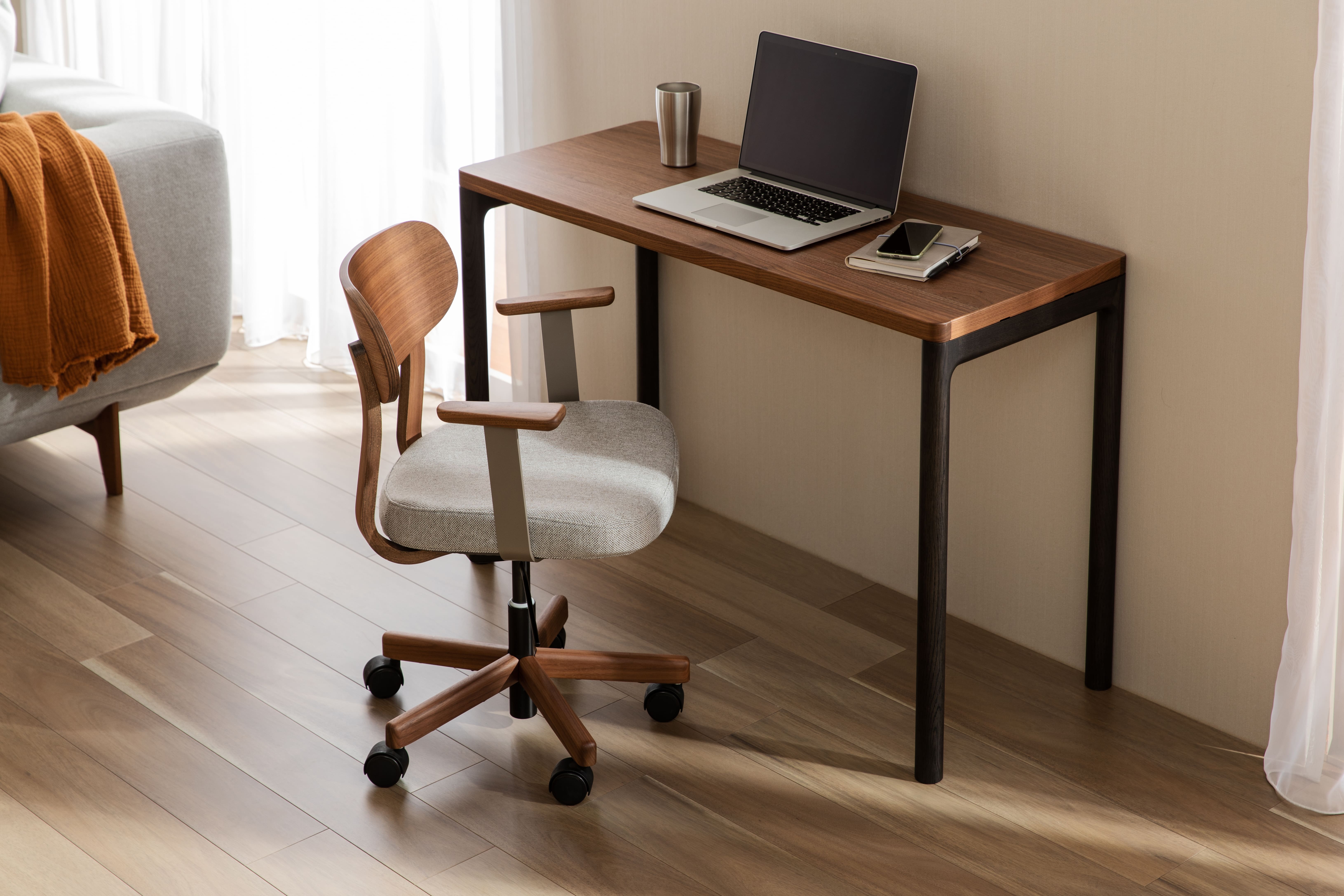XW33モデルは、リビング・ダイニングでも使いやすいコンパクトさに加えて、ウォールナット材を使ったワークチェアとしては当社唯一で、インテリアコーディネートの幅が広がりました。ゆとりのある木製のモタレとシートの柔らかな印象もさることながら、背中のサポート力とシートクッションにより身体の安定感は抜群です。削り出しのアームは小振りで控えめながら、しっとりと手になじみ、つい触れていたくなります。