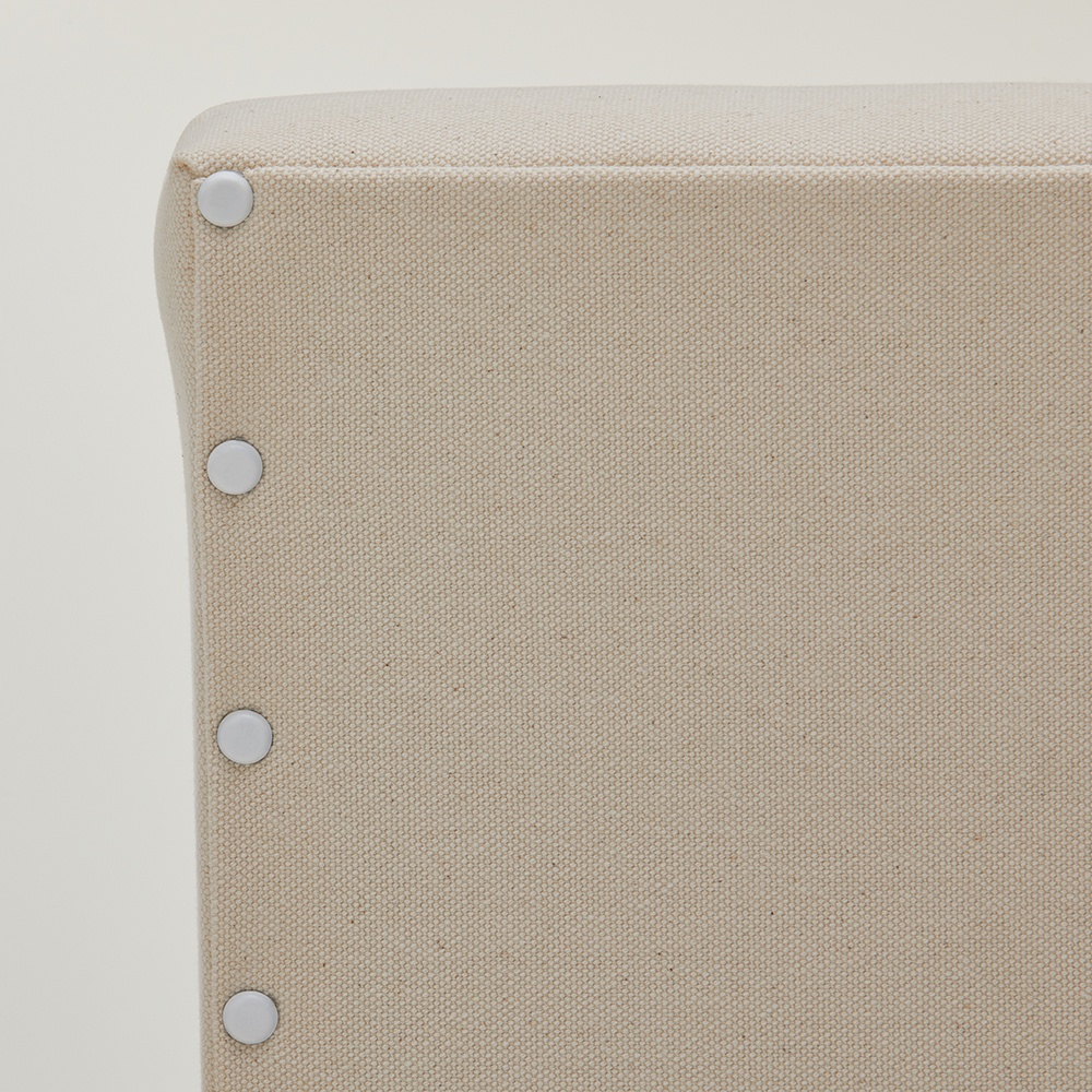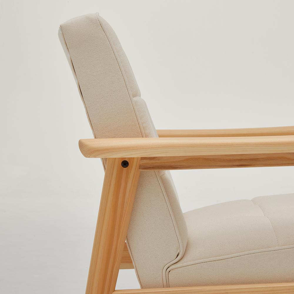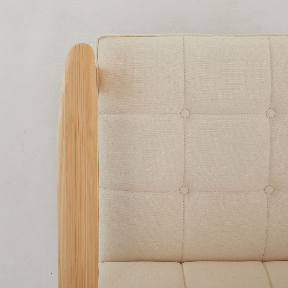 岡山県の美作ヒノキを木部に使用したKチェア。ヒノキのもつ清らかなイメージと、ぬくもりを感じる手触りが魅力です。ヒノキは針葉樹に含まれ、柔らかな樹のため強度試験を繰り返し、アーム下桟のみホワイトアッシュ材を使用することでチェアとしての強度を担保しています。張地には倉敷の帆布を使い、しっかりとしたハリの中にも、しなやかさがある風合いをお楽しみいただけます。