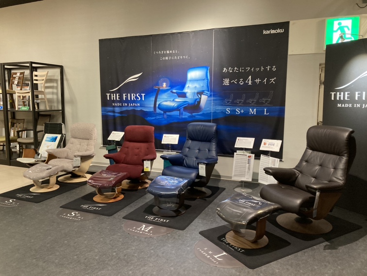 カリモク最上級の座り心地「ザ・ファースト」の売場をリニューアルしました。「S・S+・M・L」のサイズを揃え、「革張り・布張り」人気の人工スエード「ラムース」と豊富なバリエーションを体感できます。