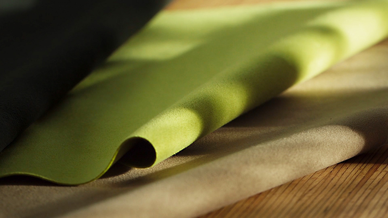 加えて、環境低負荷型素材として旭化成株式会社より誕生したDinamica®シリーズと、当社が2022年秋に発表した新商品による、コラボレーション展示をいたします。当張地はリサイクル原料を使用した人工皮革で、約30年前から水系ポリウレタンを採用した環境負荷の低い素材です。また、製造において水力発電を活用するなど、製造時から環境負荷が低い素材となっています。