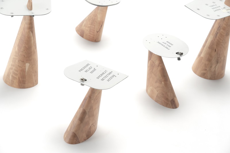 航空機の機体にはメンテナンスのために、様々な形状の点検ハッチが設けられています。この金属製のハッチに木製の脚を取り付けることで、高さの異なる2種類のサイドテーブルを制作しました。
