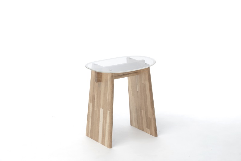 機体に沿ってしなやかに曲がったシルエットと、エッジに施されたテーパーを見て、椅子の座面に応用できると考えました。アクリルは透明なため、未利用材で作られた脚部構造を際立たせます。