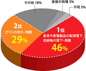 食器棚などは扉が開いて中の食器類が散乱し、テレビや電子レンジが飛んでくるといった現象も報告されています。物が直接身体に及ぼすケガに加えて、室内が散乱状態のために避難が遅れてしまうといった2次災害も含めると家具がかかわるケガの割合は全体の約75%を占めます。
