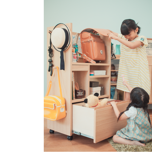 さらに、自宅で使い勝手をモニターして、仕切りやデザインなども工夫した、ママ達の声から生まれたラックなんですよ。マルチラックの下段引出しに教科書を入れて、ワンアクションで取り出せるので整理整頓も楽にできるととても好評いただいています。