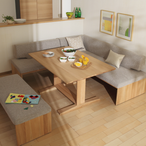 Mさま、ベンチスタイルダイニングをご愛用いただきありがとうございます。実はお部屋のコーナーはモノのたまり場になることが多く、L字のチェアーをそのスペースに置くことで、よりお部屋を広く使うことができると好評を頂いています。ベンチを壁に付けてのレイアウトも、椅子を引かなくてよいので、省スペースに繋がりますし、ベンチ下のスペースを、ボックスなどを利用して、絵本やお絵かきセットなどダイニングで使いたいものを収納する場所にしている方も多いようです。