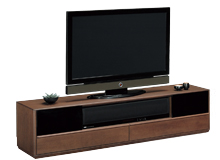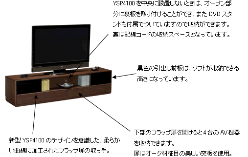 映像と音響を本格的に楽しめるリビングルームをコンセプトに、新型テレビボードを開発しました。リアルサラウンドで定評のあるヤマハサウンドプロジェクターYSP4100を、中央オープン部に設置できます。ヤマハサウンドプロジェクターの特徴は、7.1CHに対応し、部屋の隅にスピーカーを設置しなくても、反射音により、映画館さながらのリアルサラウンドを楽しめることにあります。一般的な5.1CHスピーカーセットは、インテリアとして場所を取り、配線が煩わしく、また掃除もしにくいといったデメリットがありました。反射音を利用することで、すっきりしたインテリアで本格的な音響が楽しめるという考えに賛同し、弊社では2005年よりヤマハサウンドプロジェクターに対応したテレビボードを生産し、今年で5年目を迎えます。