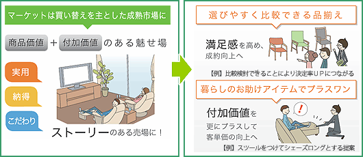 店頭での提案性、品揃え、商品知識力の重要性が益々高くなってきており、お客様の価値観に対応するため、より密接にメーカーと小売が協力体制にあるべきだと考え、2年前より、各地区の有力得意先様に対し、カリモクの魅力が伝わる差別化MDと売り場作りを「カリモクギャラリー」と位置づけ店頭MDの差別化を図り、生産性の高いギャラリー構築のために「マーチャンダイジング」「マネジメント」「セールスプロモーション」という観点からギャラリー計画をご提案してまいりました。そして今年は、もう一歩踏み込んで「実用」「納得」「こだわり」をキーワードに、お取組先のお客様を想定し、そのお客様のニーズやウォンツに対して具体的に何が良いのか、何が分かりやすいのかを売り場に表現できる「売場改善のご提案」をさせていただきます。