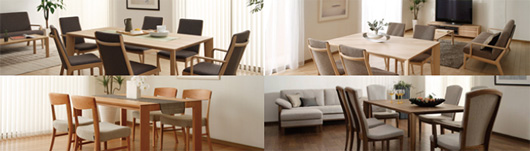 世界の銘木を身近で味わえる、プレミアムなオーダーメニュー。部屋の床材や好みに合わせて、ソファ、テーブル、椅子やテレビボードなどのアイテムを、オーク、メープル、ブラックチェリー、ウォールナットの4タイプから樹種を選んでオーダーしていただけます。素材はすべて天然木。自然の表情や、変化してゆく色艶をお楽しみ下さい。